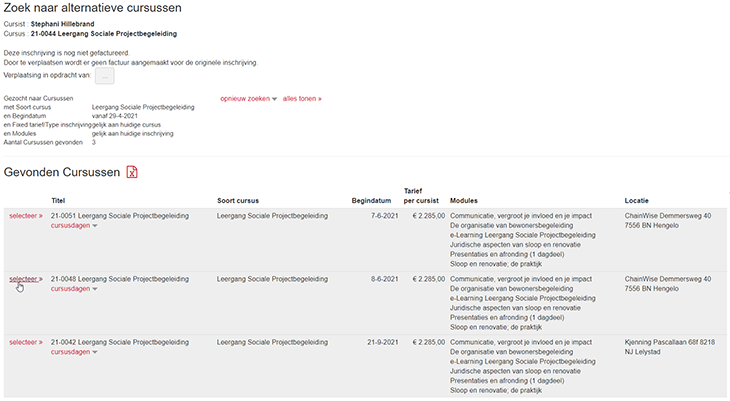 Los van het verplaatsen van cursussen hebben veel opleiders te maken met verplaatsing van cursisten/inschrijvingen. De cursist moet uitgeschreven worden van de cursus, waarvoor eventueel een creditnota gemaakt moet worden. Vervolgens moet er op zoek gegaan worden naar andere data waarop dezelfde cursus gegeven wordt. Hierop zal de nieuwe inschrijving gedaan moeten worden.