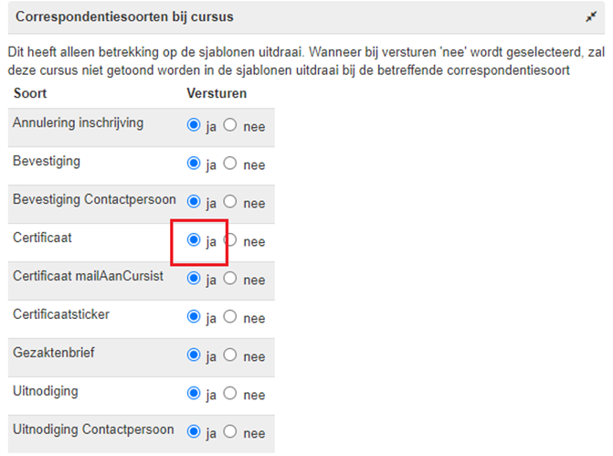 1. Per correspondentiesoort van een cursus kan aangegeven worden of deze verstuurd mag worden. Controleer of dit op “Ja” staat voor de betreffende correspondentiesoort.